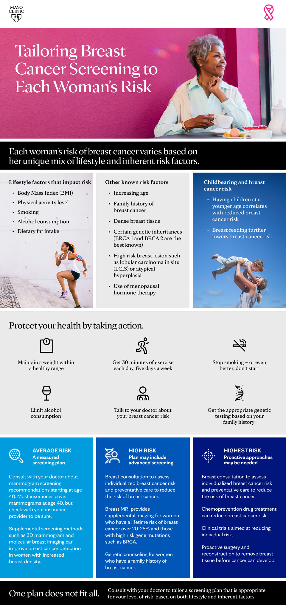 Infographic: Breast Cancer Risk Share Facebook Twitter Print details Hide Text Tailoring Breast Cancer Screening to Each Woman's Risk Each woman's risk of breast cancer varies based on her unique mix of lifestyle and inherent risk factors. Lifestyle factors that can impact risk Body mass index (BMI) Physical activity level Smoking Alcohol consumption Dietary fat intake Other known risk factors Increasing age Family history of breast cancer Dense breast tissue Certain genetic mutations (BRCA 1 and 2 are best known) High risk breast lesion such as lobular carcinoma in situ (LCIS) or atypical hyperplasia Use of menopausal hormone therapy Childbearing and breast cancer risk Having children at a younger age correlates with reduced breast cancer risk Breast feeding further lowers risk Protect your health by taking action. Maintain a weight within a healthy range Get 30 minutes of exercise each day, five days a week Stop smoking — or even better, don't start Limit alcohol consumption Talk to your doctor about your breast cancer risk Get the appropriate genetic testing based on your family history Average risk A measured screening plan Consult with your doctor about mammogram screening recommendations starting at age 40. Most insurances cover mammograms at age 40, but check with your insurance provider to be sure. Supplemental screening methods such as 3D mammogram and molecular breast imaging can improve breast cancer detection in women with increased breast density. High risk Plan may include advanced screening Breast consultation to assess individualized breast cancer risk and preventative care to reduce the risk of breast cancer. Breast MRI provides supplemental imaging for women who have a lifetime risk of breast cancer over 20-25% and those with high risk gene mutations such as BRCA. Genetic counseling for women who have a family history of breast cancer. Highest risk Proactive approaches may be needed Breast consultation to assess individualized breast cancer risk and preventative care to reduce the risk of breast cancer. Chemoprevention drug treatment can reduce breast cancer risk. Clinical trials aimed at reducing individual risk. Proactive surgery and reconstruction to remove breast tissue before cancer can develop. One plan does not fit all. Consult with your doctor to tailor a screening plan that is appropriate for your level of risk, based on both lifestyle and inherent factors. Sources: MayoClinic.org; Cancer.org. IFG-20441205